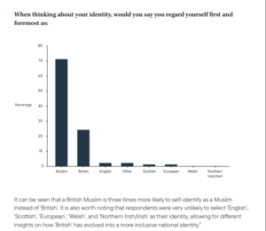 Is it Fascistic or right wing to ally your identity to a set of beliefs? Muslims do it. Islam is socially conservative and most British Muslims, as seen in the chart below, identify as Muslim over being British.