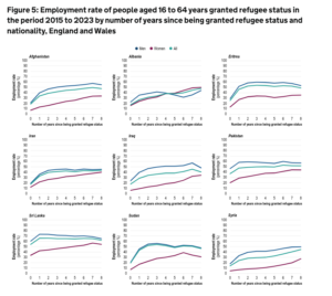Almost a quarter (24%) of refugees aged 16 to 64 years who were granted refugee status between 2015 and 2023 found employment in the first year in which they arrived in the UK (0 years after arrival). The rate of employment reached around 45% after 2 years and then increased more slowly to 48% for those who had refugee status for 8 years.”