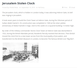 Tucked away on the website is this little gem of a story of how the UK stole the Palestinian’s clock in 1922 and transplanted it to London, where we know it today as Big Ben