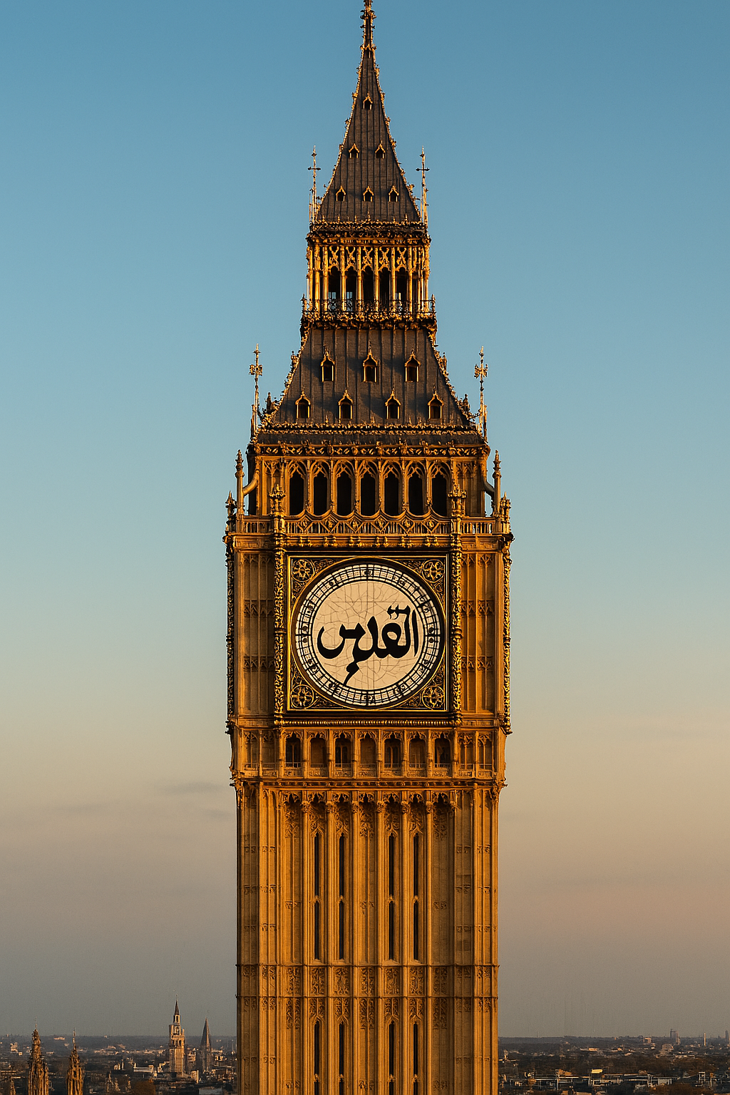 However: Taken no doubt from an earlier version of the theft of Big Ben found here on Facebook, where it was known as the Al-Quds Clock :